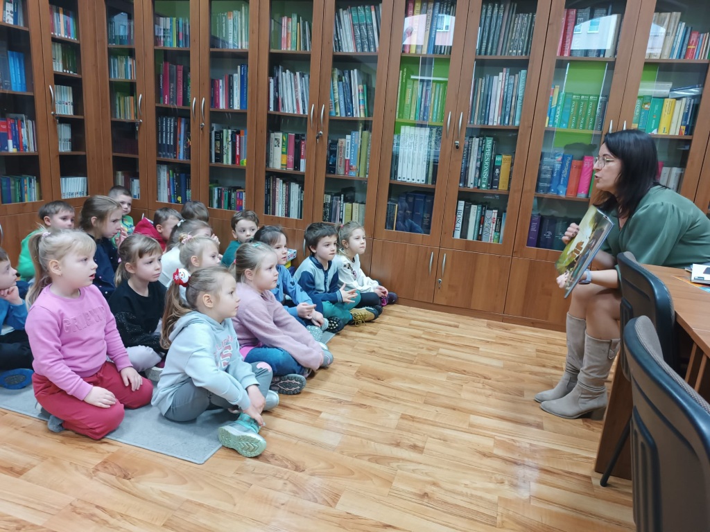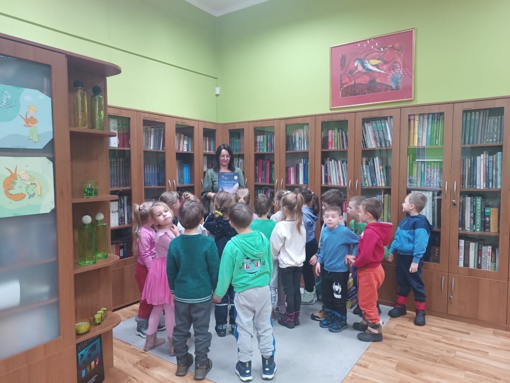 Delfinki na zajęciach czytelniczych w bibliotece szkolnej .